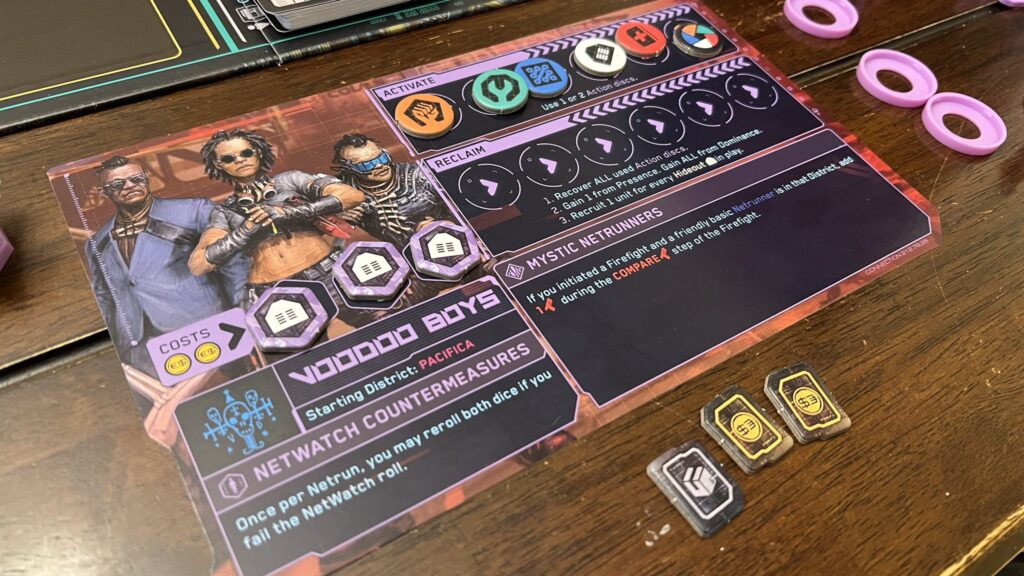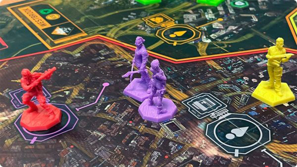 – Podstawki figurek… Przy dużej ilości ich na planszy dostajemy oczopląsu. Może w kolejnych grach będzie łatwiej, ale na razie musieliśmy sprawdzać czy to na pewno dany rodzaj figurki. Do tego edgerunerzy mają tą samą podstawkę, a różne profesje. Wprowadzało to zamieszanie i sprawdzanie częste kto jest kim. Kwadrat jeszcze był w miarę ok, ale ten sześciokąt i heks… Trójkąt by dali to chyba było by czytelniejsze. Z kumplami rozmawialiśmy o tym, aby przemalować podstawki figurek na kolor znacznika akcji co powinno rozwiązać problem.