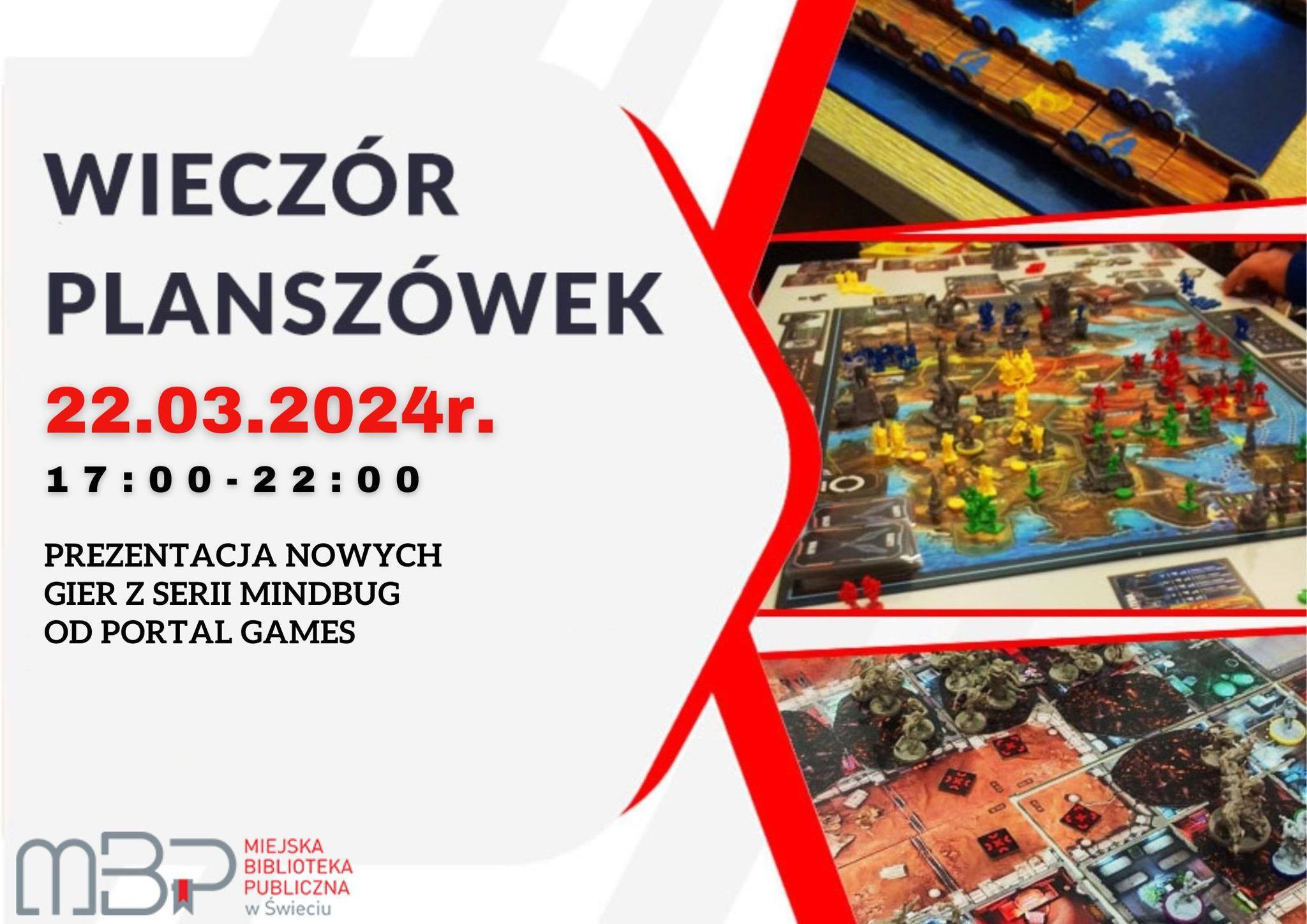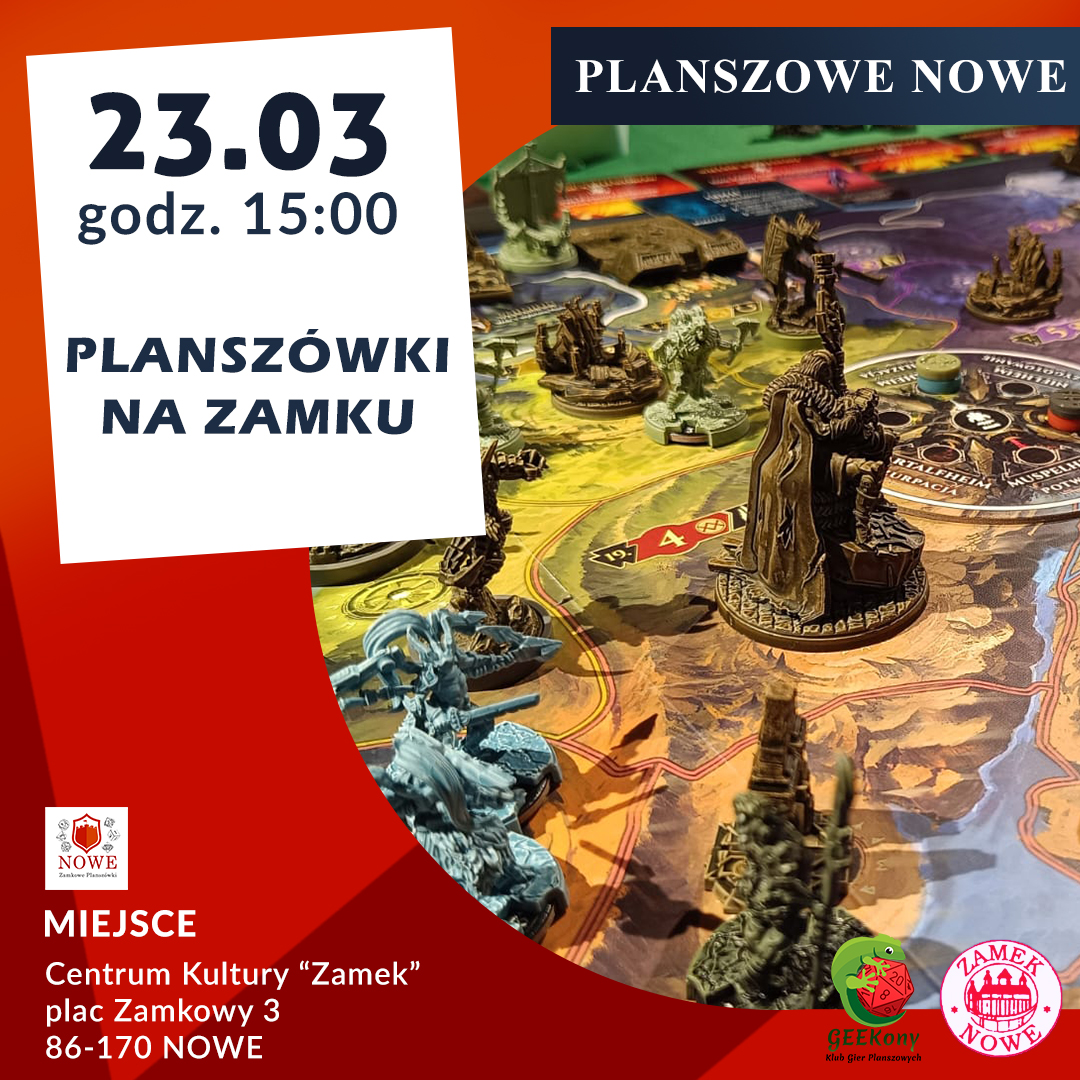 NOWE plac Zamkowy 3, Nowe23.03.2024 godzina 15:00 Klub Gier Planszowych GEEKony oraz Gminna Biblioteka Publiczna w Nowem zapraszają do wspólnej zabawy przy planszówkach . Miejsce poddasze Centrum Kultury “Zamek” plac Zamkowy 3 86-170 NOWE Gry: Przygodowe Strategiczne Logiczne Kooperacyjne i wiele innych Młodzi i dorośli gracze są bardzo mile widziani . Gry planszowe będą dostępne różnym przedziale wiekowym. Jeżeli do tej pory nie […]